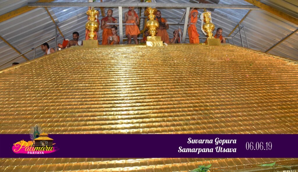 The most awaited program of Suvarna Gopura Samarpana Utsava was carried out successfully today. The Brahma Kalasha over the newly built suvarna gopura was installed by the peethadhipatis of Ashta Matha.