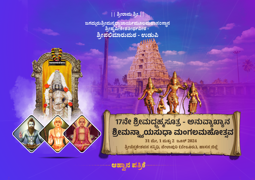 His Holiness Sri Sri Vidyadheesha Teertha Swamiji, the Peethadhipati of Sri Palimaru Matha, is conducting Srimadbrahmasootra Anuvyakhyana Srimannyaya Sudha Mangala in the shrine of Shri Channa Keshava, Beluru Kshetra, for the 17th batch of His disciples. This program will be held from 31st May to 2nd June 2024.Also, during this program, Shri Swamiji is conducting